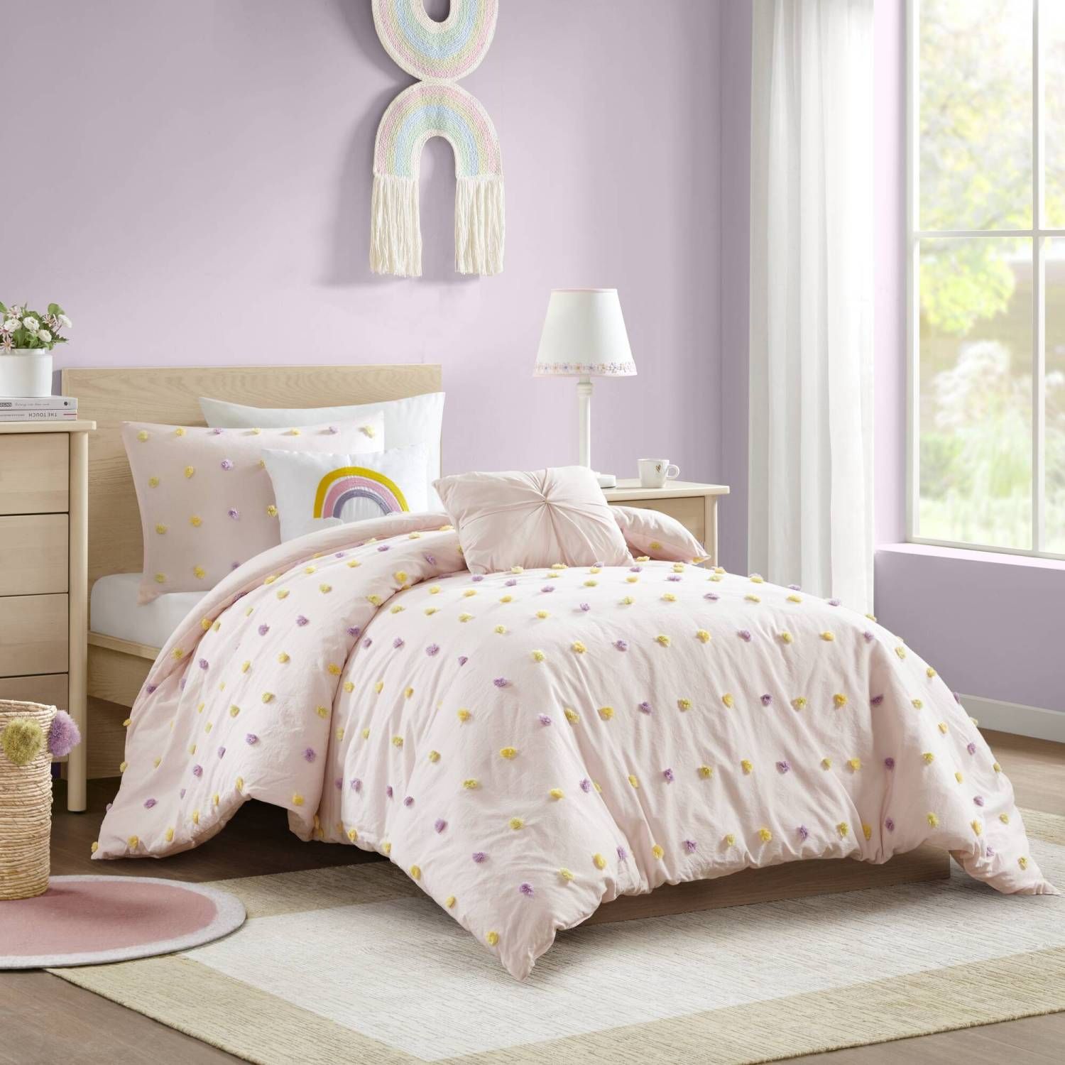 Comforter and decorative pillows have polyester hypoallergenic filling