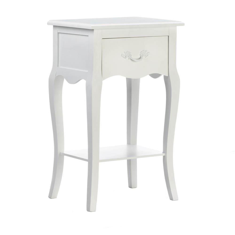 • This romantic country nightstand fits nicely anywhere, whether it's tucked next to your bed or in the children's room. Featuring one drawer and a lower open shelf, this table's white finish makes a timeless addition to your space.